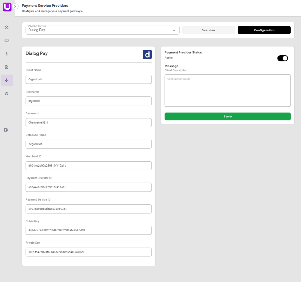 • Required Credentials: DialogPay provides all necessary unique credentials, including Public/Private Keys, Merchant ID, and Service IDs, ensuring a secure, authorized connection.
