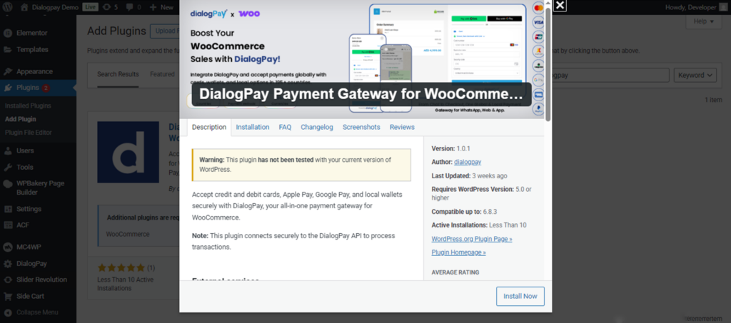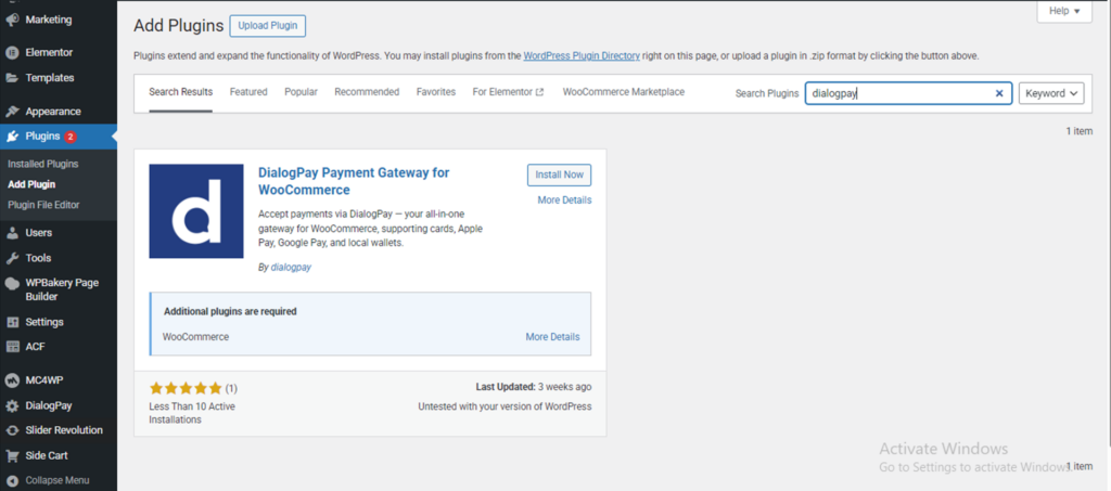 3. Search for “DialogPay Payment Gateway for WooCommerce.”